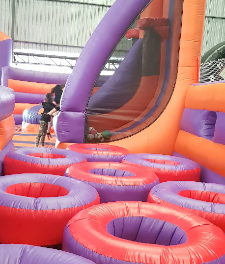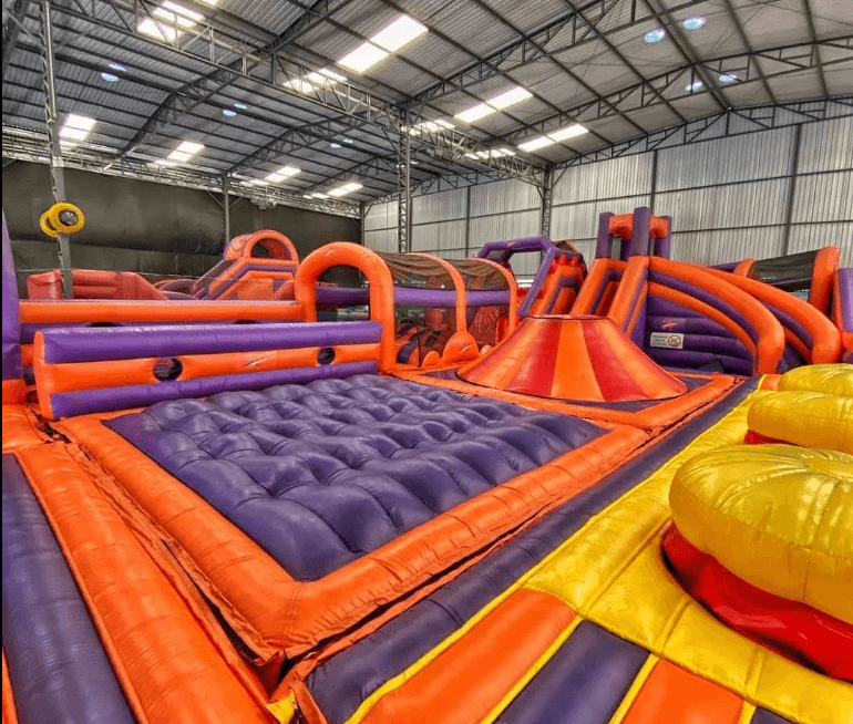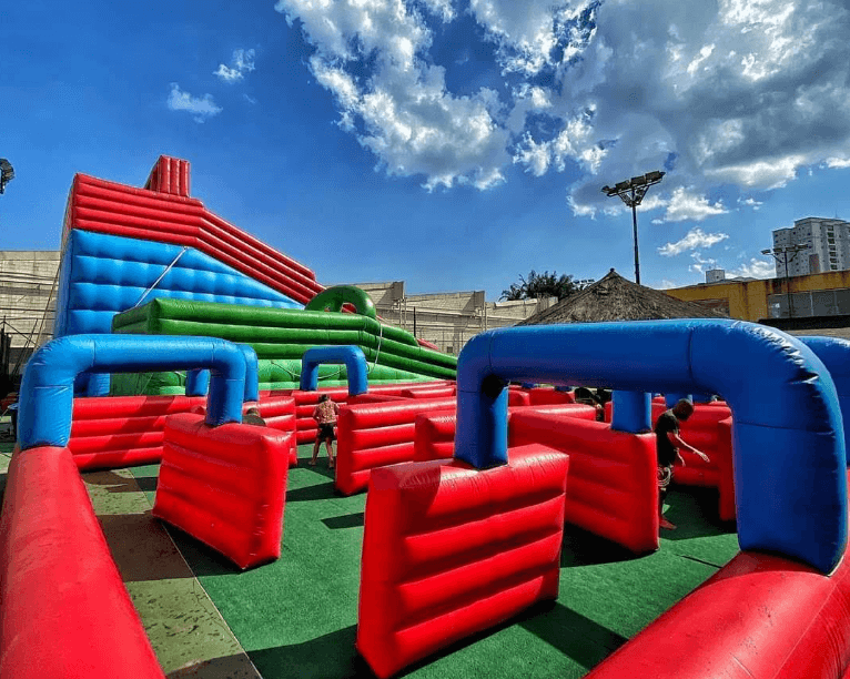 Uma pista inflável extensa e complexa que exige que o participante corra, escale e salte entre diferentes barreiras no menor tempo possível.